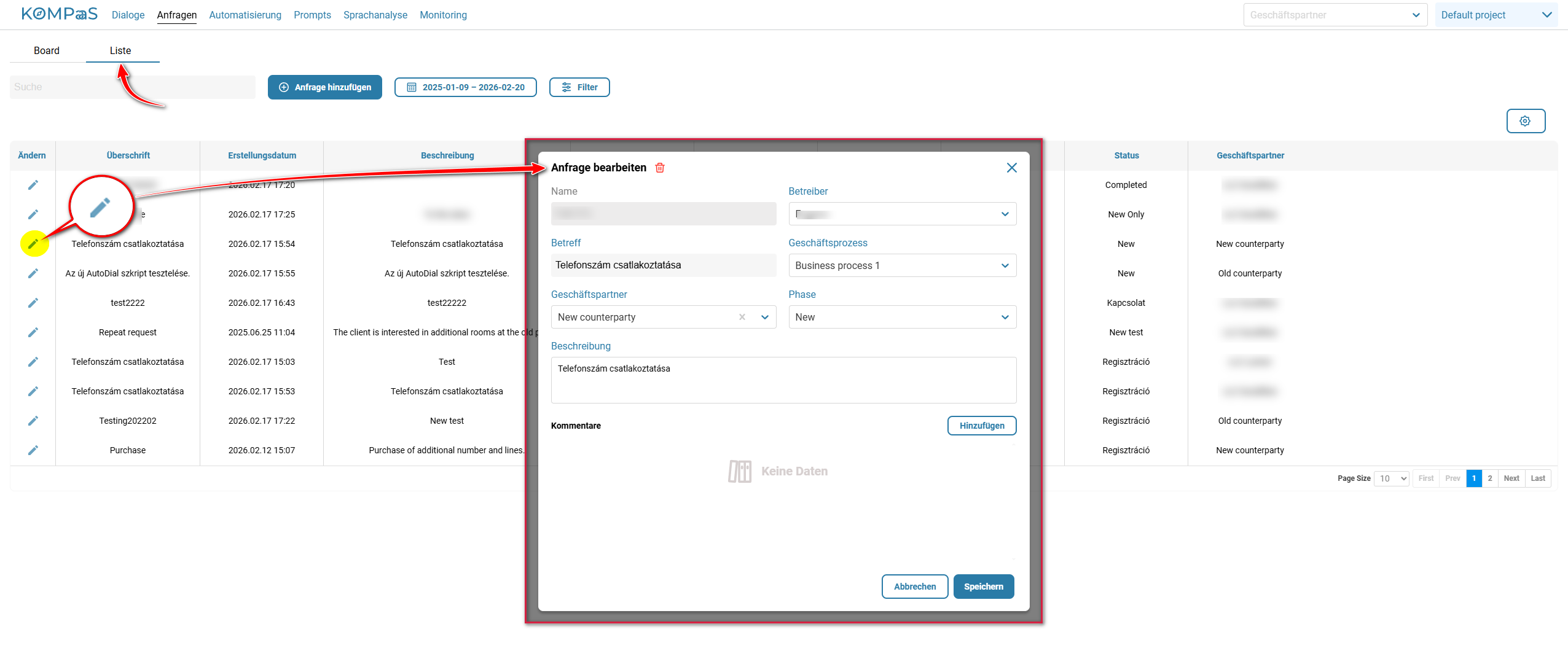 • Die Registerkarte 'Liste' enthält den Verlauf der Anfragenerstellung. Sie ermöglicht es auch, Anfragen zu erstellen und zu bearbeiten.