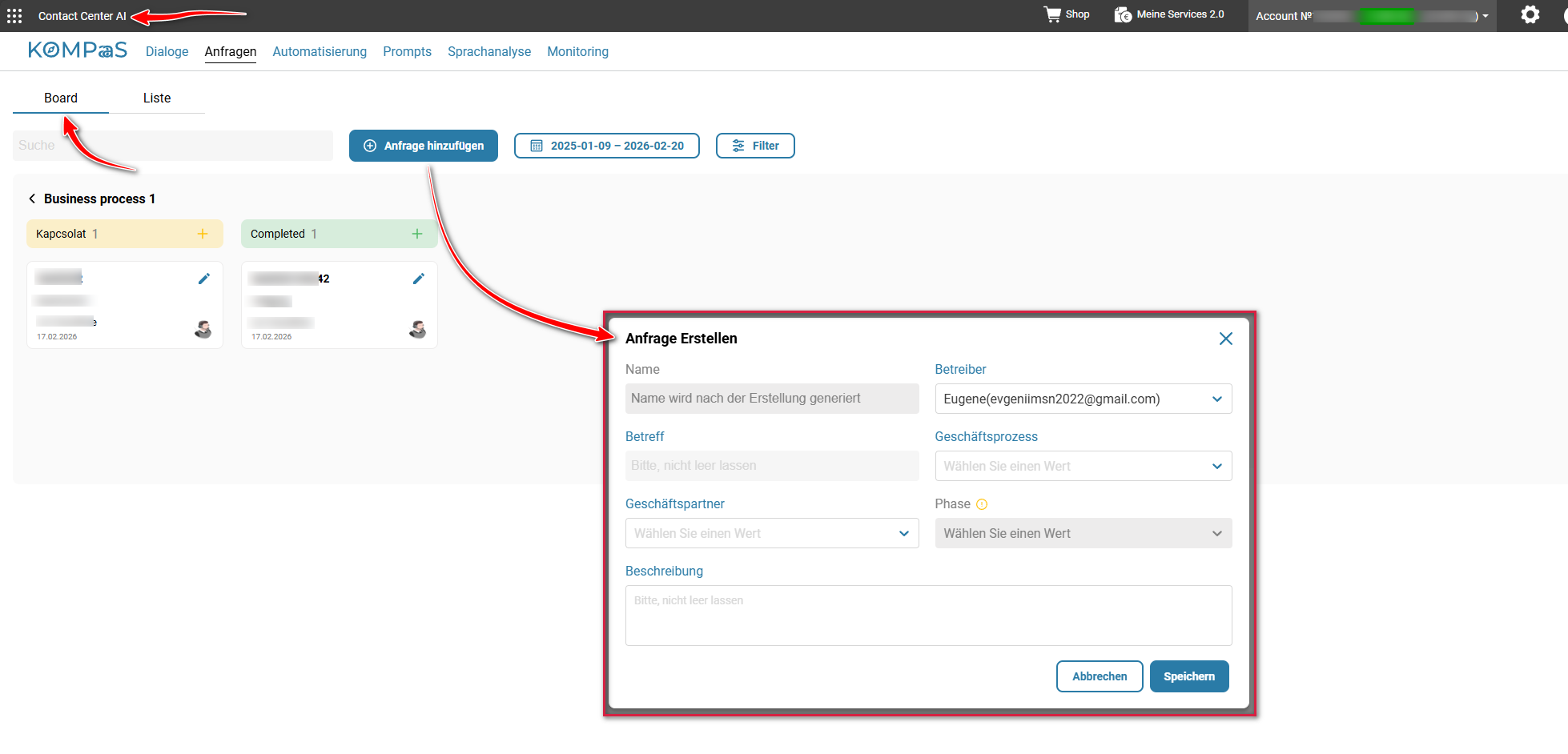 2. Füllen Sie im sich öffnenden Fenster 'Anfrage Erstellen' die Felder aus.
