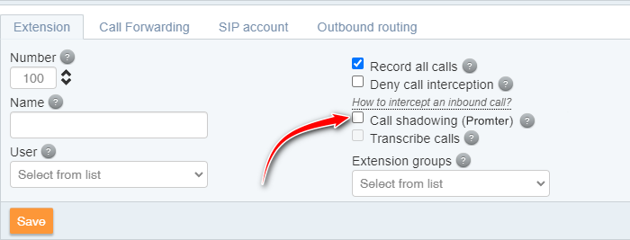 The virtual PBX provides the opportunity to connect the "Call shadowing" feature.