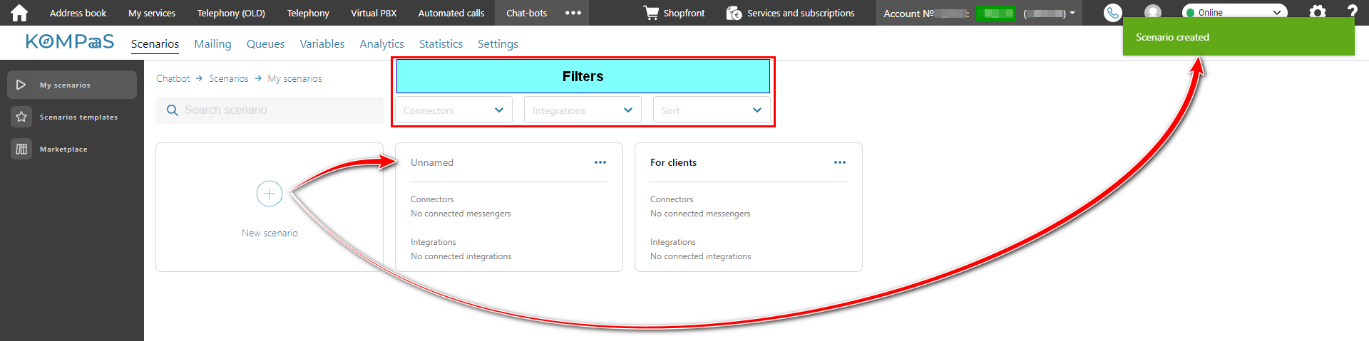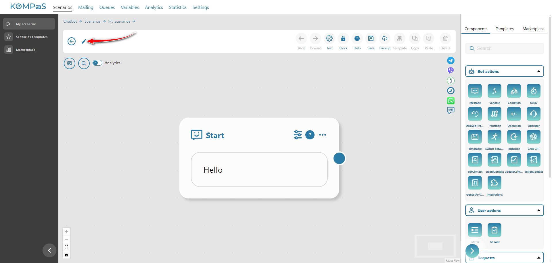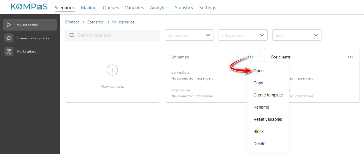 Scenarios are a set of components and arcs through which the interlocutor "moves" when using the bot. When the end of the scenario is reached (no arcs leading further), the chatbot goes to the beginning of the scenario.