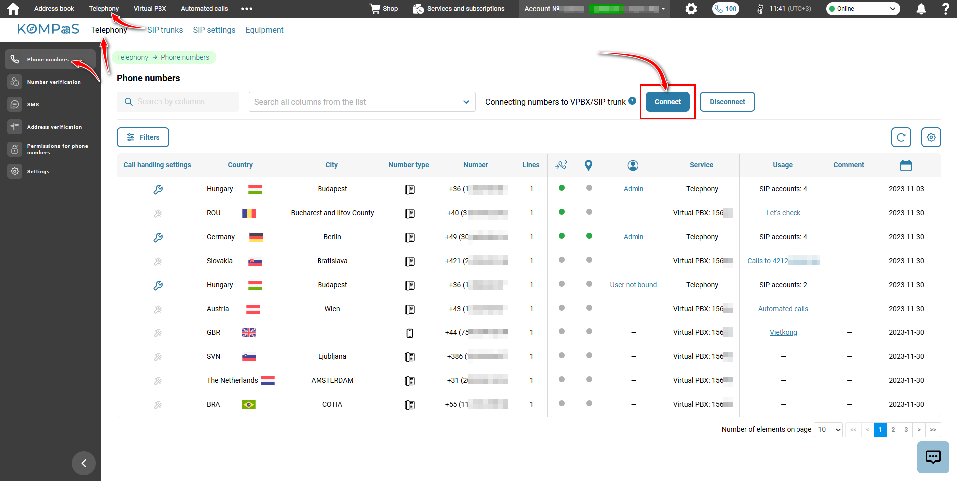 The 'Connect' and 'Disconnect' buttons are available if the 'Virtual PBX' or 'SIP trunk' service is connected, and the text next to it depends on which service numbers are purchased — 'Connecting numbers to VPBX/SIP trunk', 'Connecting numbers to VPBX' or 'Connecting numbers to SIP trunk'.