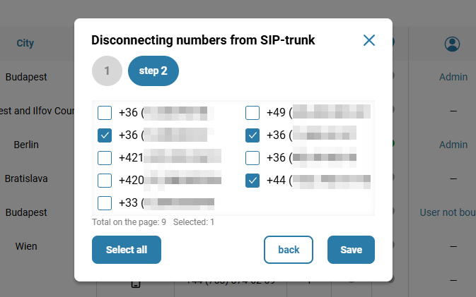Check the numbers you want to disconnect from the trunk. To remove all numbers from the trunk at once, click the 'Select all' button.