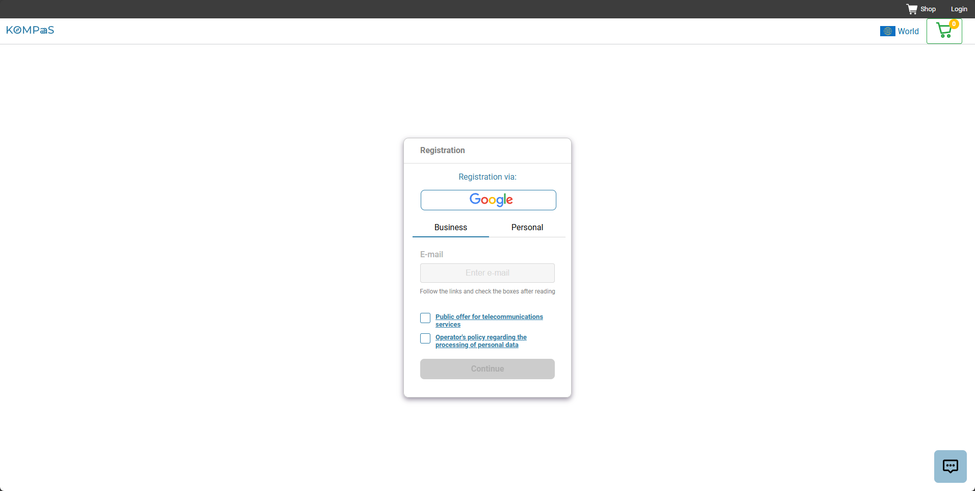 To register on the website, choose how you are registering - Business or Personal. Then, enter your email address, and read the Public offer for telecommunications services and Operator's policy regarding the processing of personal data, then check the boxes and click 'Continue'.