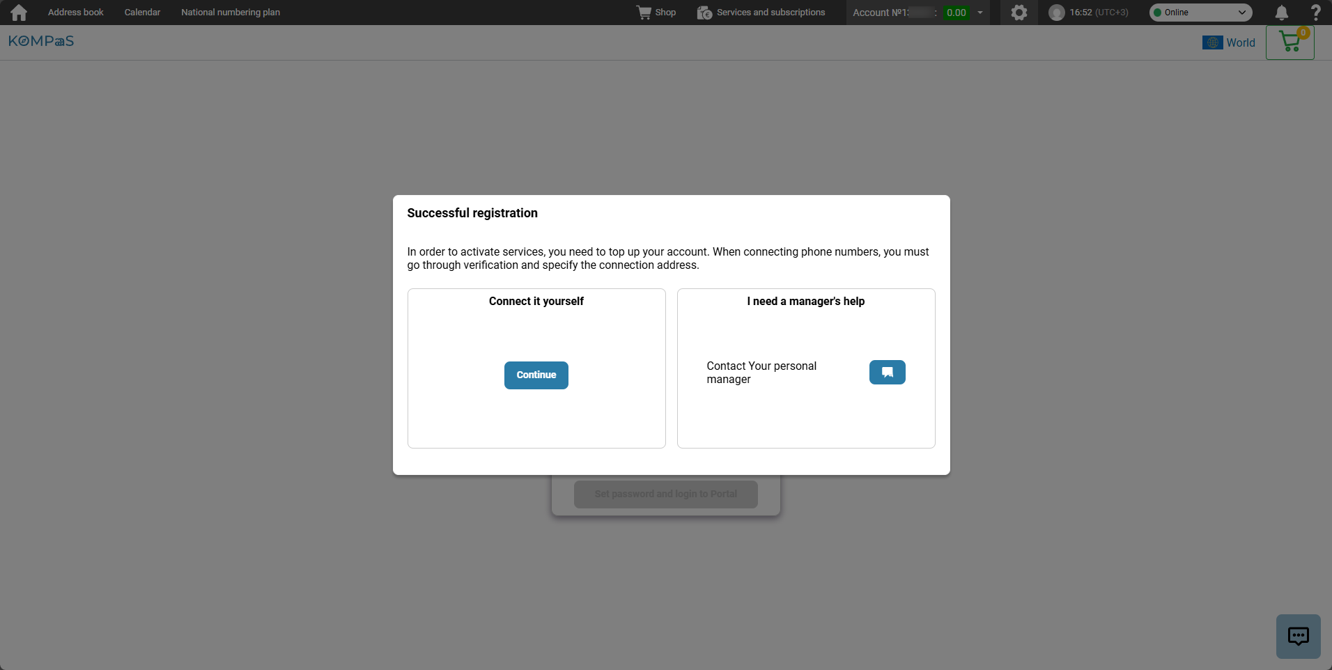 Personal account has been created. On your screen, you can see the choice - continue registration on your own or write to a manager for help.