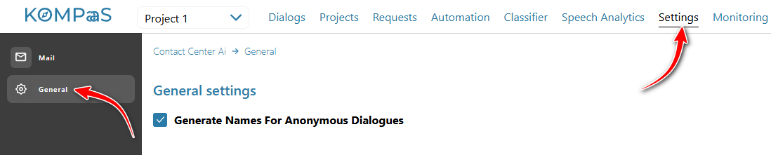 In the 'Contact Center AI' section on the 'Settings' tab, parameters that don't require frequent adjustments are specified.