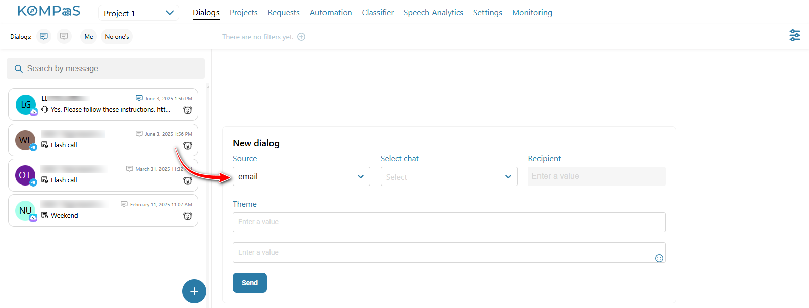 You can send an email on the 'Dialogs' tab. The email address is selected from those pre-defined in chatbots.