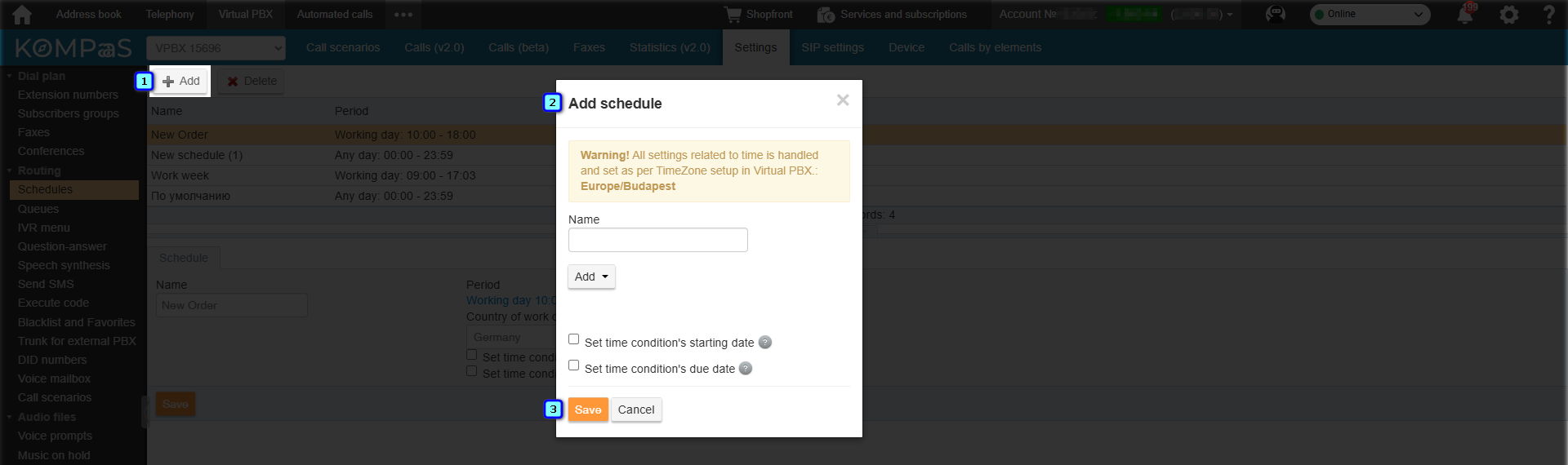 To set up call schedules, go to the Virtual PBX section, Settings >> tab, and from the left menu, Routing >> Schedules.