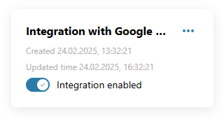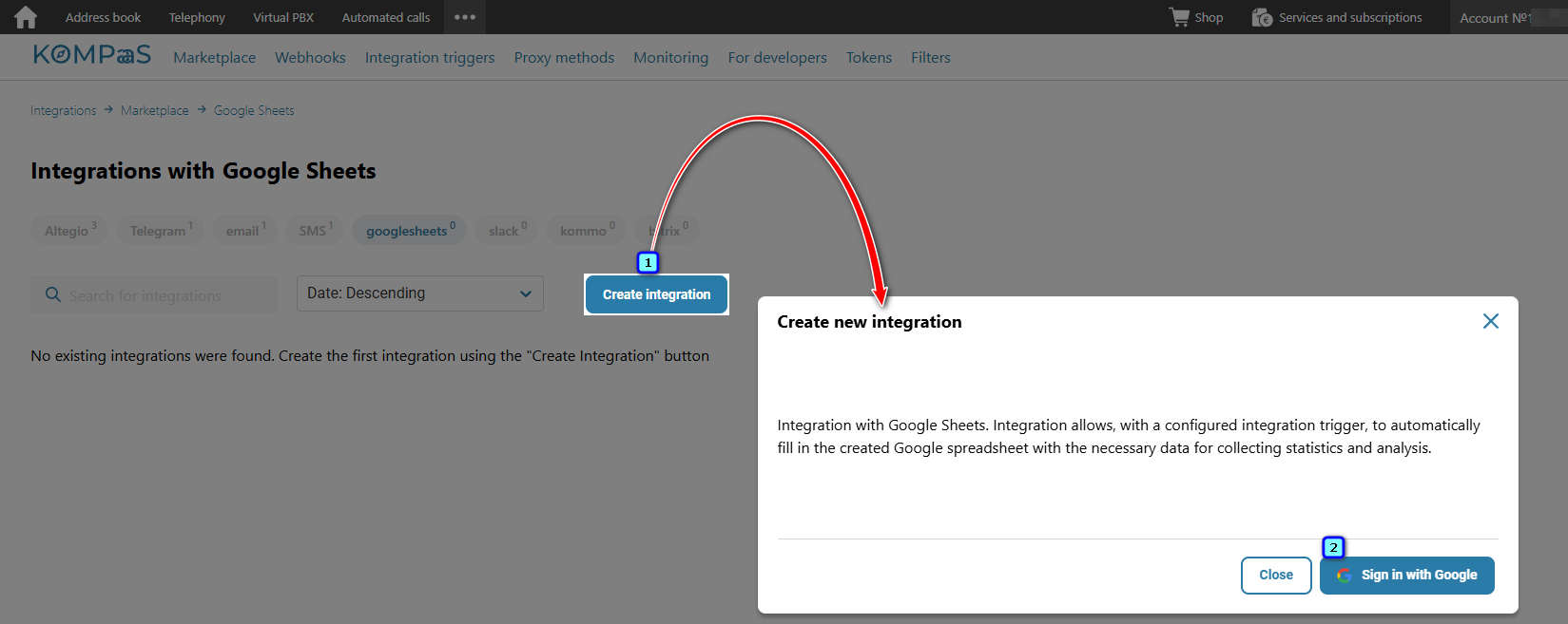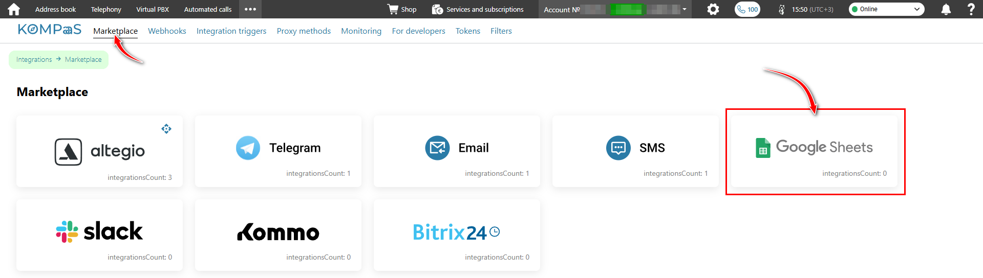 To create an integration, go to your KOMPaaS Personal Account, to the 'Integrations' → 'Marketplace' section and click on the 'Google Sheets' block.