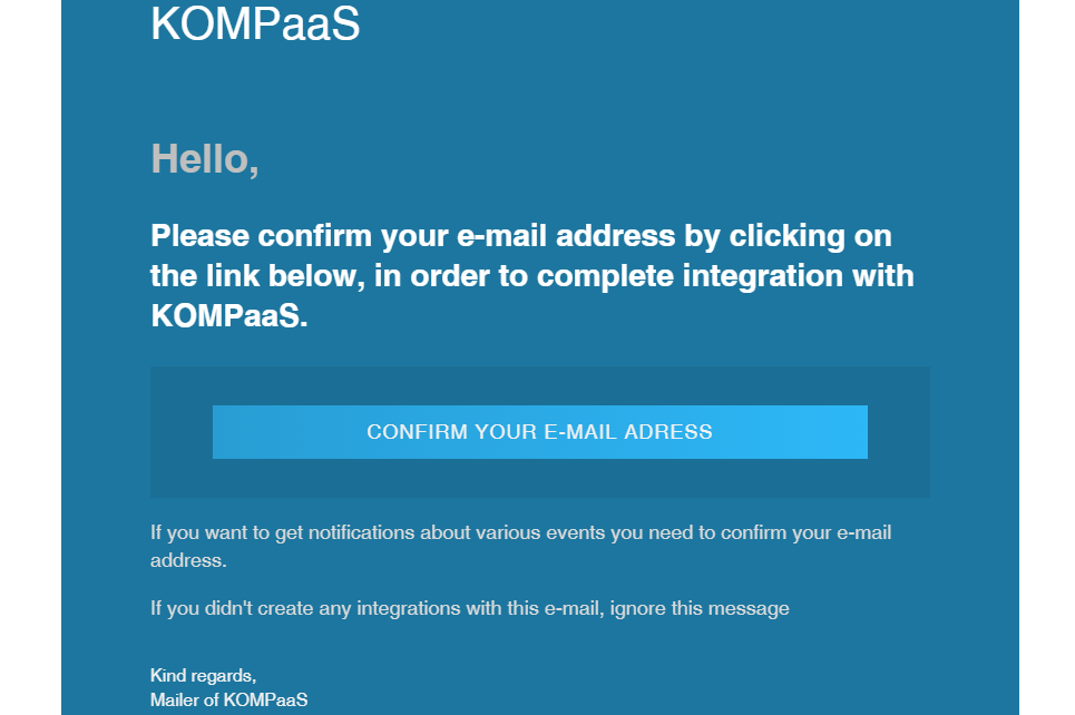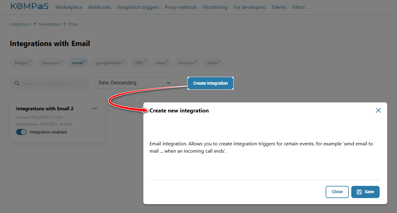 To create an integration, go to your KOMPaaS Personal Account, to the 'Integrations' section → 'Marketplace' tab and click on the Email integration block.