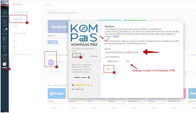 - Pegue la clave API copiada y configure los números internos de los empleados que corresponden a los números internos en la interfaz de la centralita virtual.