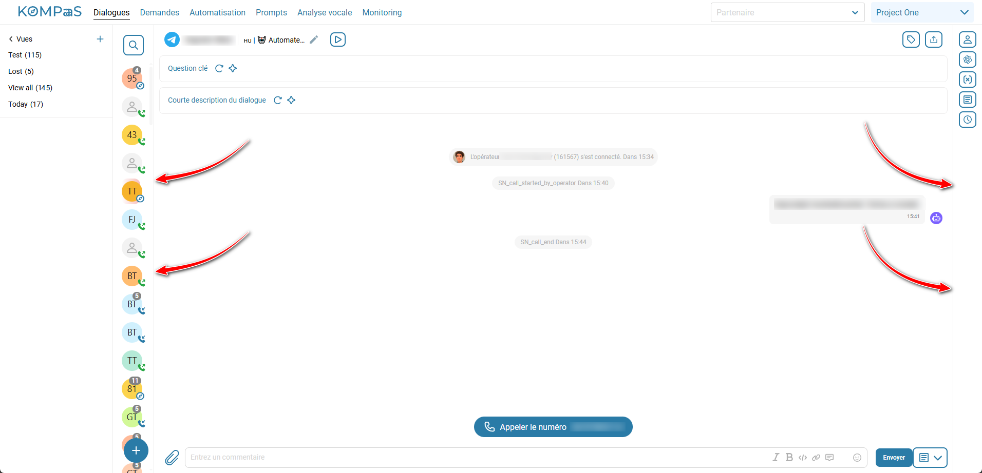 Les appels qui passent par le standard téléphonique virtuel sont transcrits (reconnus) et transmis au Centre de contact IA après la fin de l'appel. Ces transcriptions permettent d'analyser et d'utiliser ultérieurement les données des appels sous forme de dialogues.