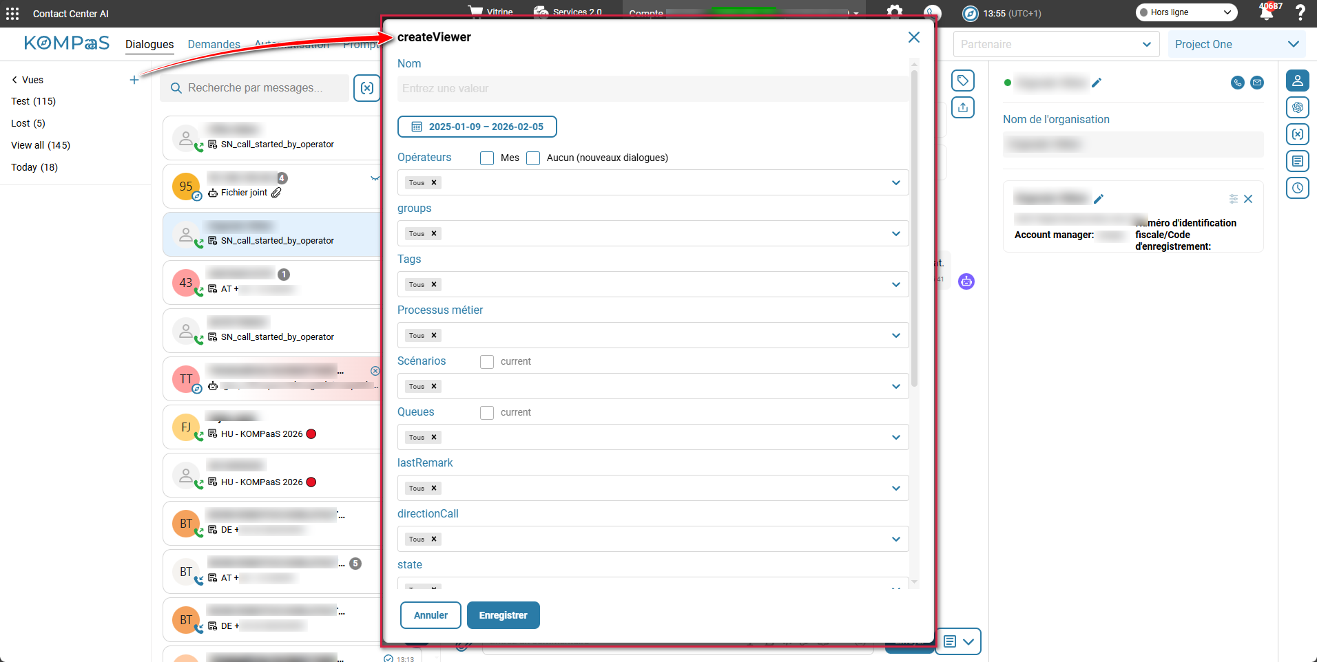 Le Centre de contact IA permet de créer une 'Vue' à partir de différents filtres - cliquez sur le bouton en forme de + (plus).
