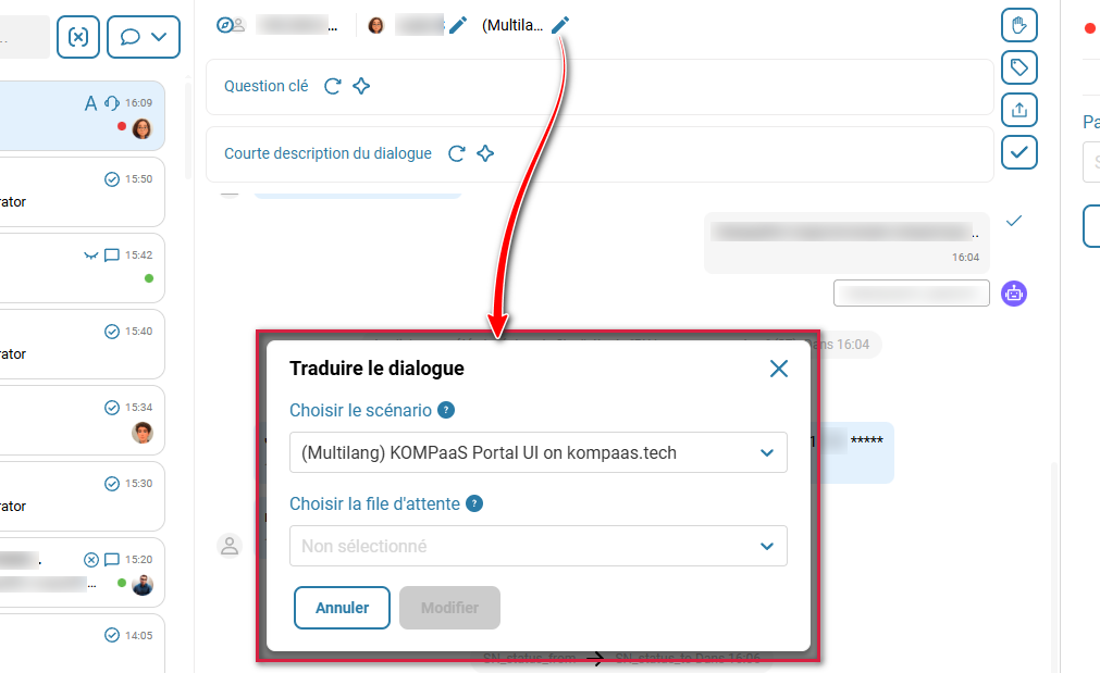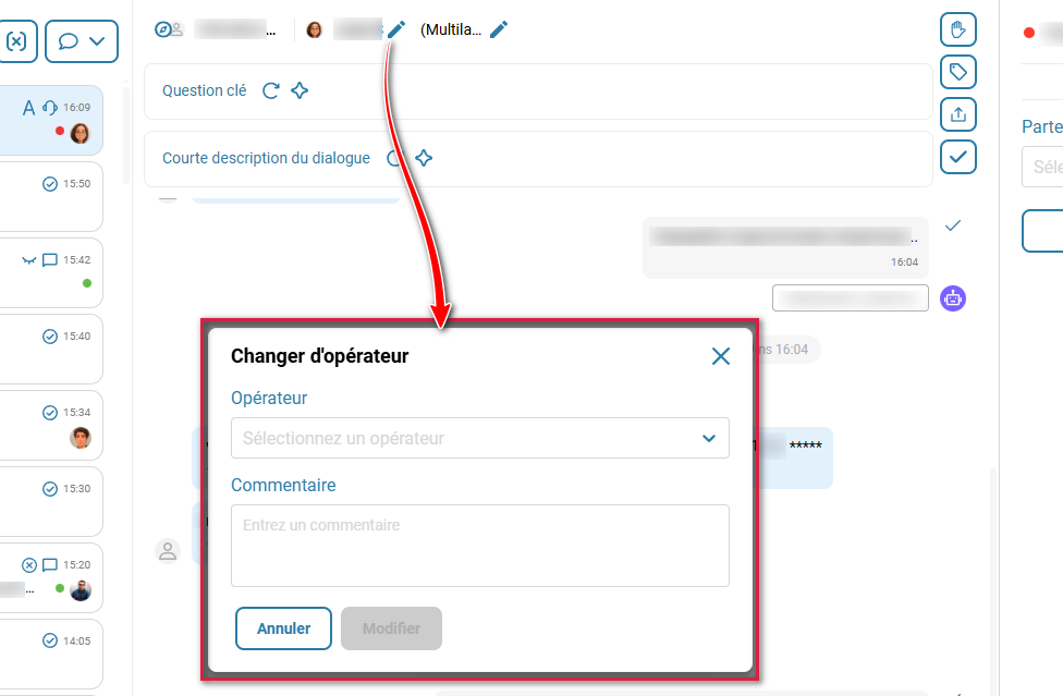 Pour réassigner un dialogue à un autre opérateur, cliquez sur l'icône avec un crayon à côté du nom de l'opérateur. Sélectionnez un opérateur dans la liste déroulante et cliquez sur 'Modifier'.
