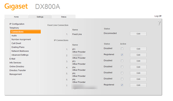 Kattintson a “Settings”-re, majd azon belül a “Telephony” alatt a “Connection”-re. A megjelenő menüben válassza ki “edit”-re kattintva azt az IP vonalat, amelyre telepíteni szeretné a melléket.