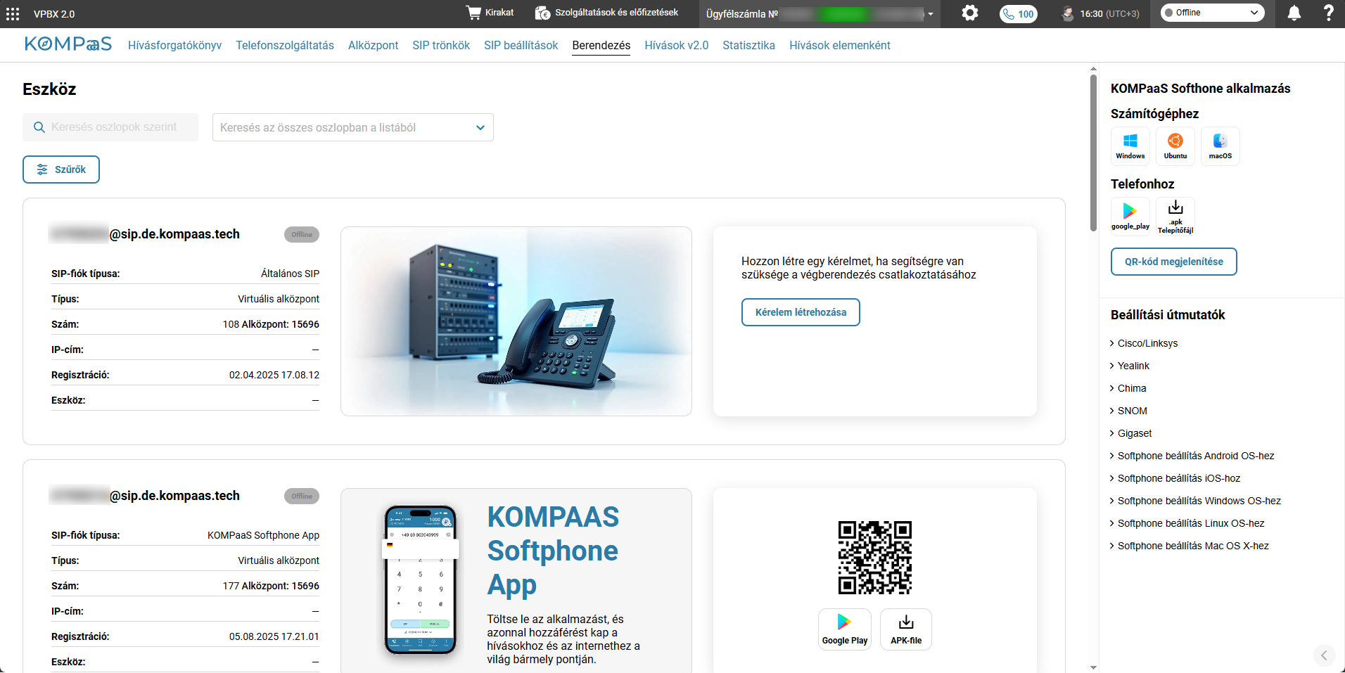 A «VPBX 2.0 | Eszköz» menüpont alatt, lehet megtekinteni a softphone beállítási útmutatókat előre telepitett beállításokkal. A «Telefonszolgáltatás 2.0 | SIP beállítások» menüpont alatt pedig megtalálhatóak a részletes SIP adatok.