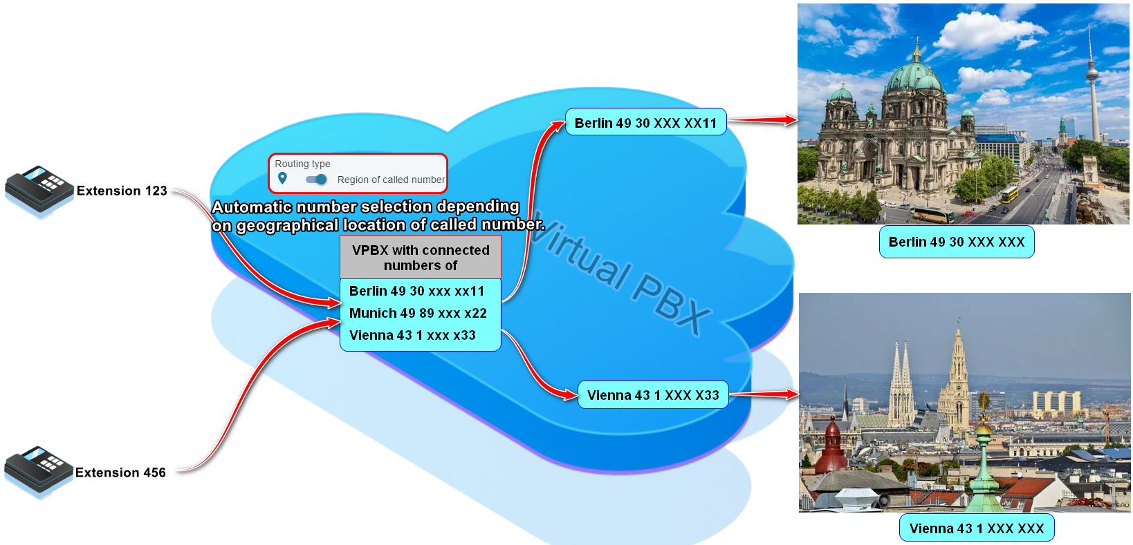 Ha az opció engedélyezve van, a rendszer meghatározza a hívott előfizető földrajzi helyzetét, és a hívásokat automatikusan ezen a régión keresztül irányítja. Ha például berlini és bécsi számok vannak a virtuális alközponthoz csatlakoztatva, akkor Berlinből Bécsbe irányuló hívás esetén a bécsi számot fogja használni.