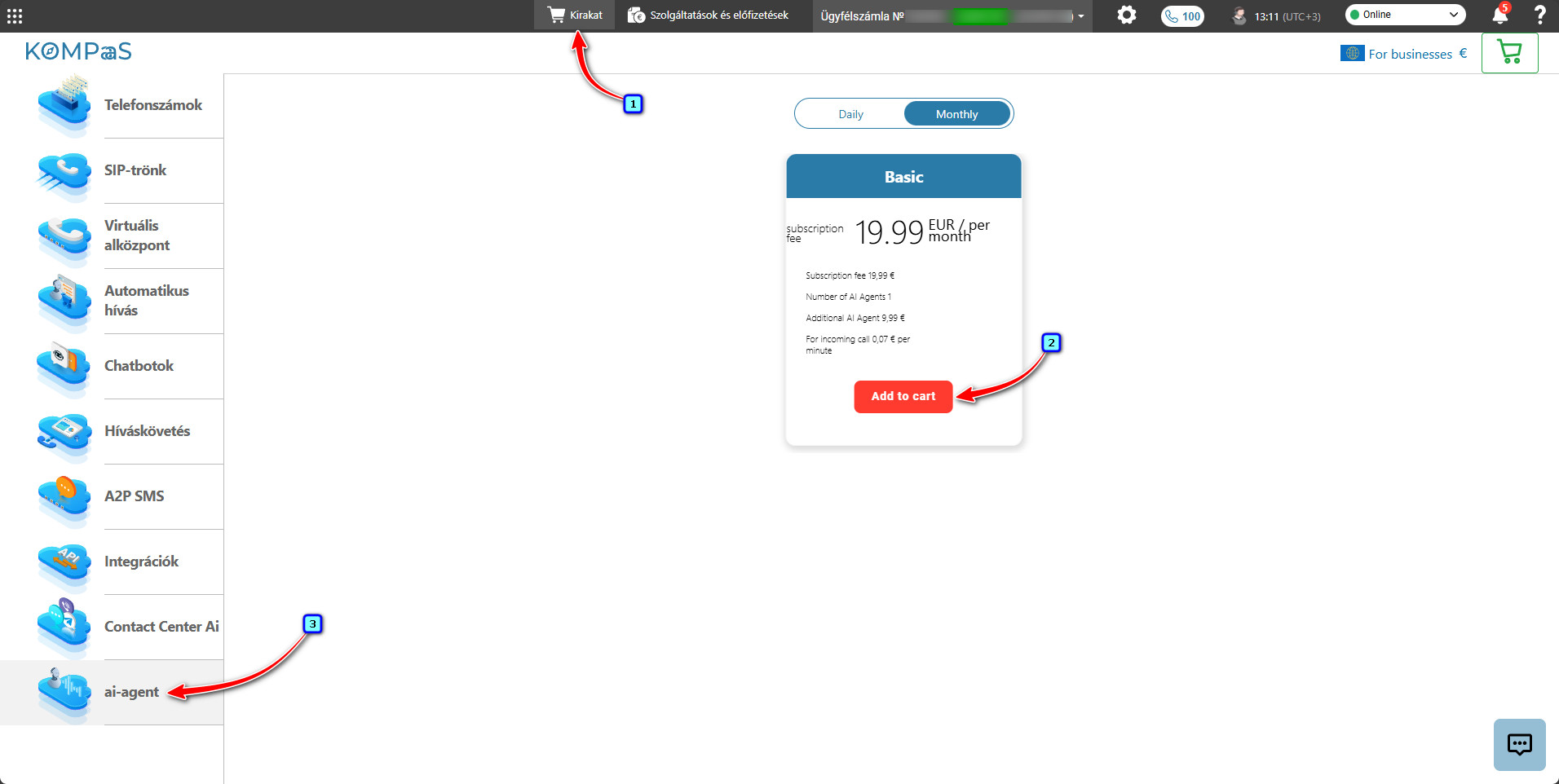 A felső menüben menjen a 'Kirakat' → bal oldali menü 'AI-agent' részhez.