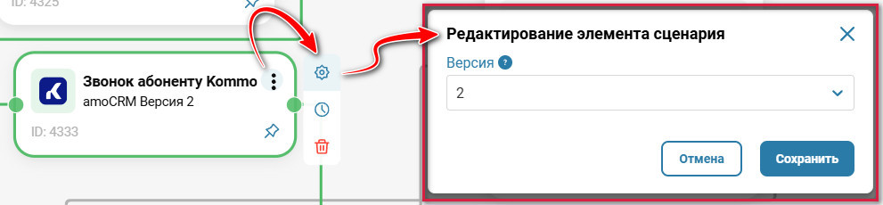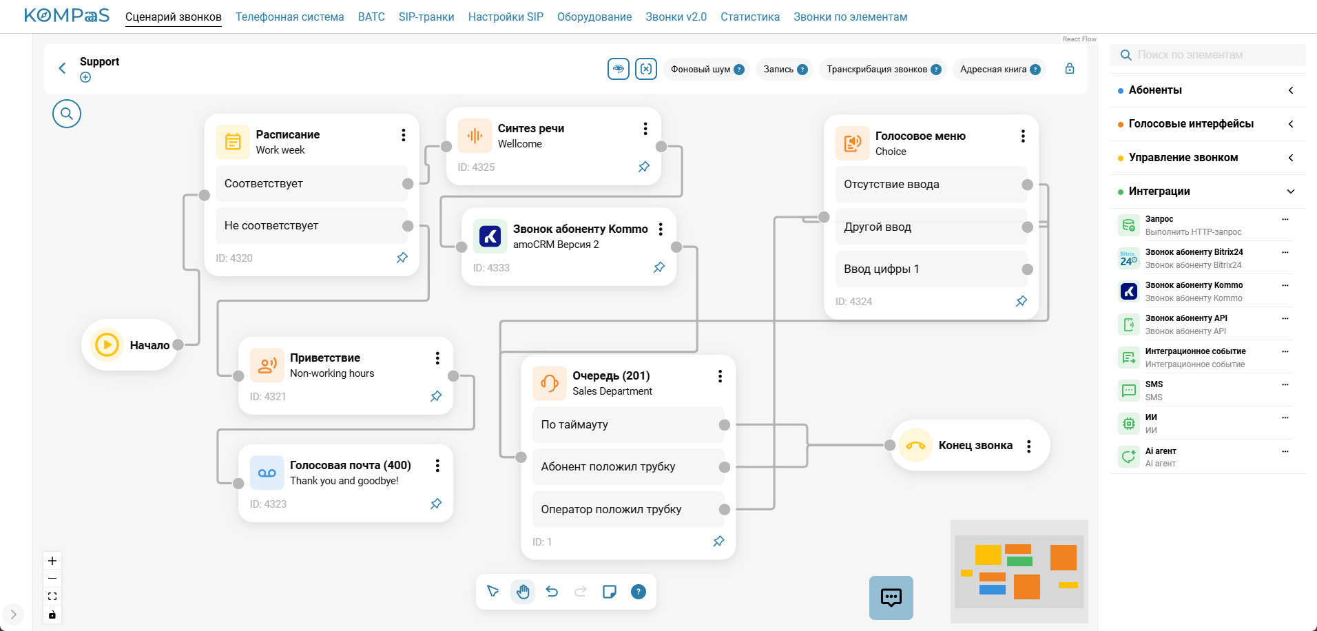 Чтобы добавить элемент ‘Звонок Абоненту Kommo’ в разделе ‘ВАТС 2.0’ → вкладка ’Сценарии звонков’: