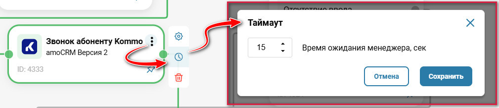 На тот случай, когда сотрудник не ответил на звонок клиента, установите флажок ’Время ожидания менеджера, сек’ и выберите количество секунд, после которых звонок пойдет на другое направление. При снятом флажке ‘Время ожидания менеджера, сек’ элемент ‘Звонок Абоненту Kommo’ будет конечной точкой маршрута.