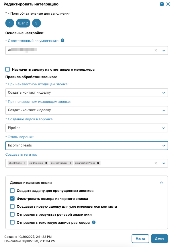 Назначить сделку на ответившего менеджера — эта опция позволяет автоматически назначать лид менеджеру, который ответил на звонок.