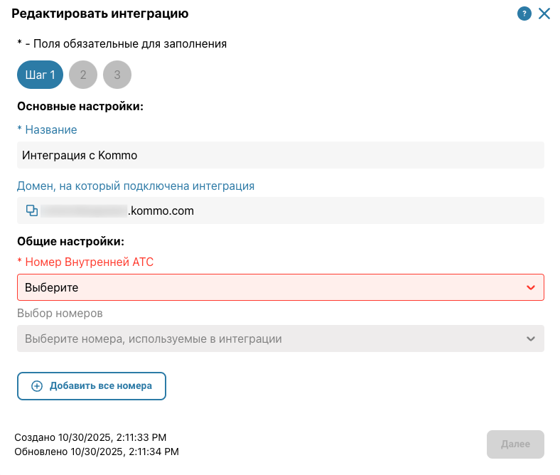 Домен, на который подключена интеграция — домен Kommo, к которому подключена интеграция. Это поле не редактируемое.
