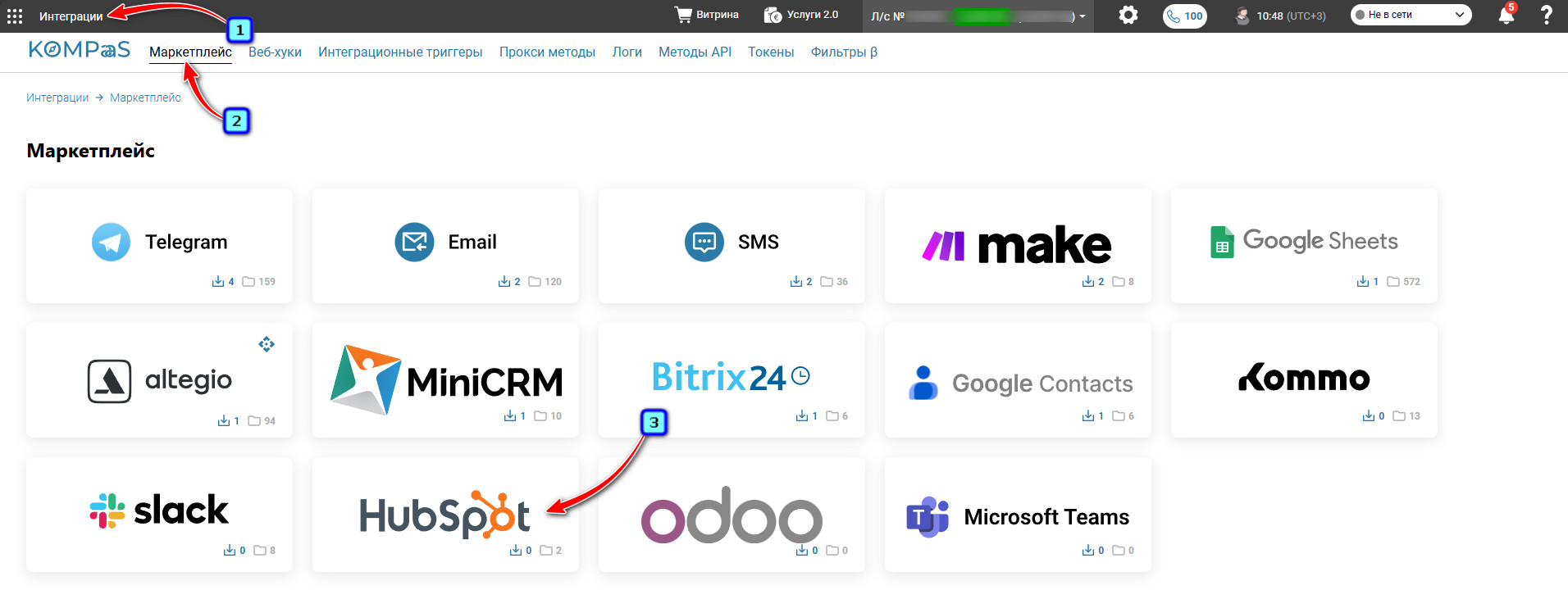 В Личном кабинете KOMPaaS прейдите в раздел «Интеграции» → «Маркетплейс» и нажмите на блок интеграции «HubSpot».