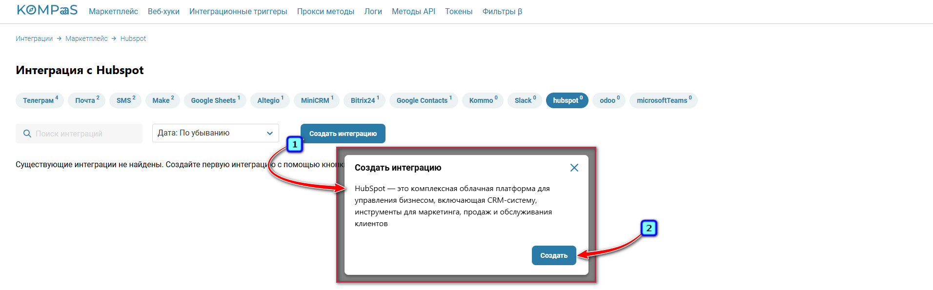 Нажмите кнопку «Создать интеграцию» → затем кнопку «Создать».