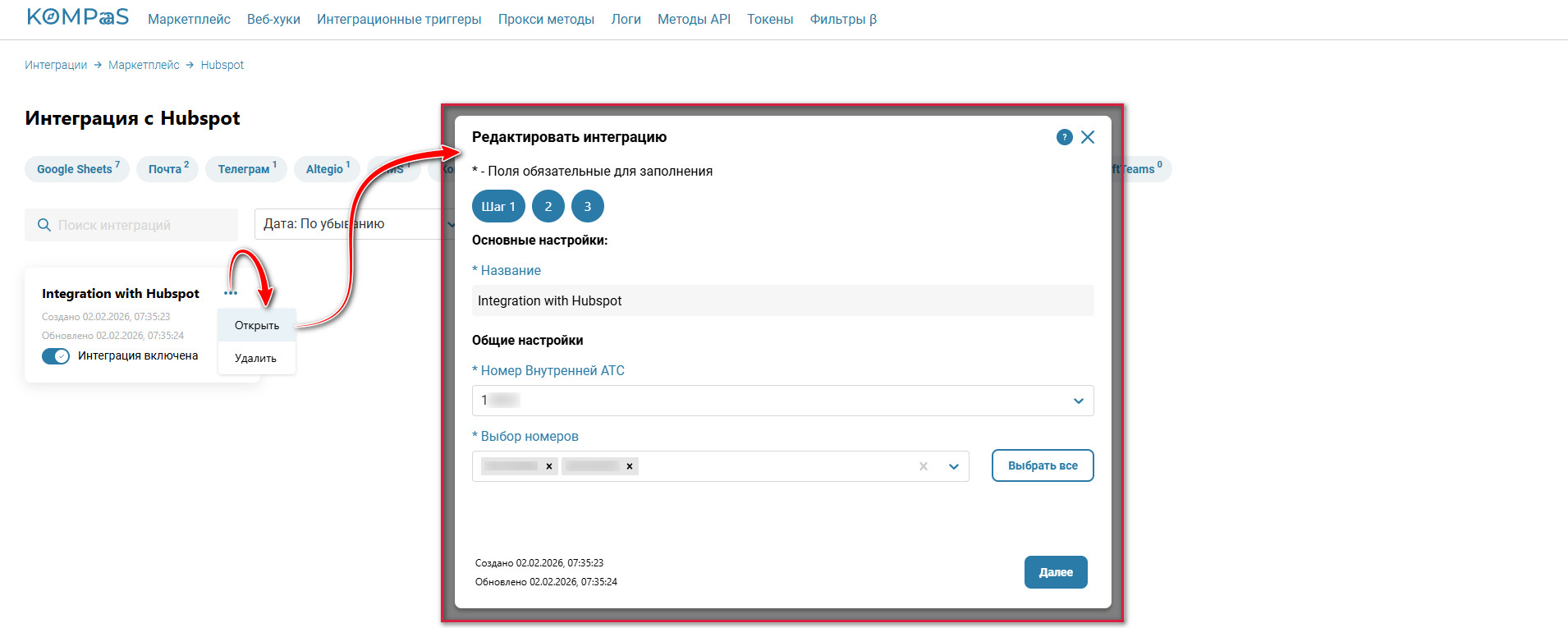 Шаг 1 — Выберите номера которые будут участвовать в интеграции с HubSpot или нажмите кнопку «Выбрать все».
