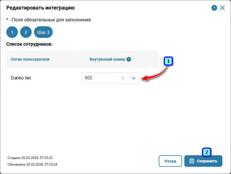Шаг 3 — Закрепите внутренние номера за пользователями интеграции.